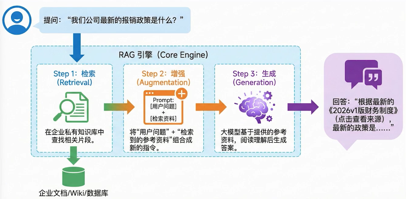 RAG(retrieval-augmented generation)直译为检索增强生成,简单来说就是增强大模型的能力,让大模型可以检索用户提供的文本资料,而不需要每次都将这些文本资料通过token传递给大模型。